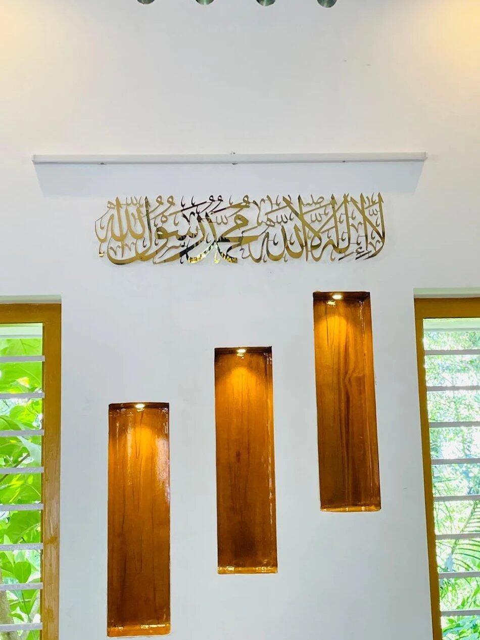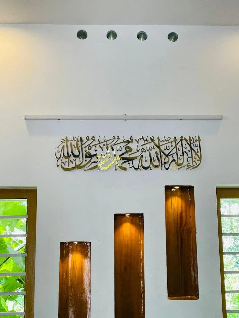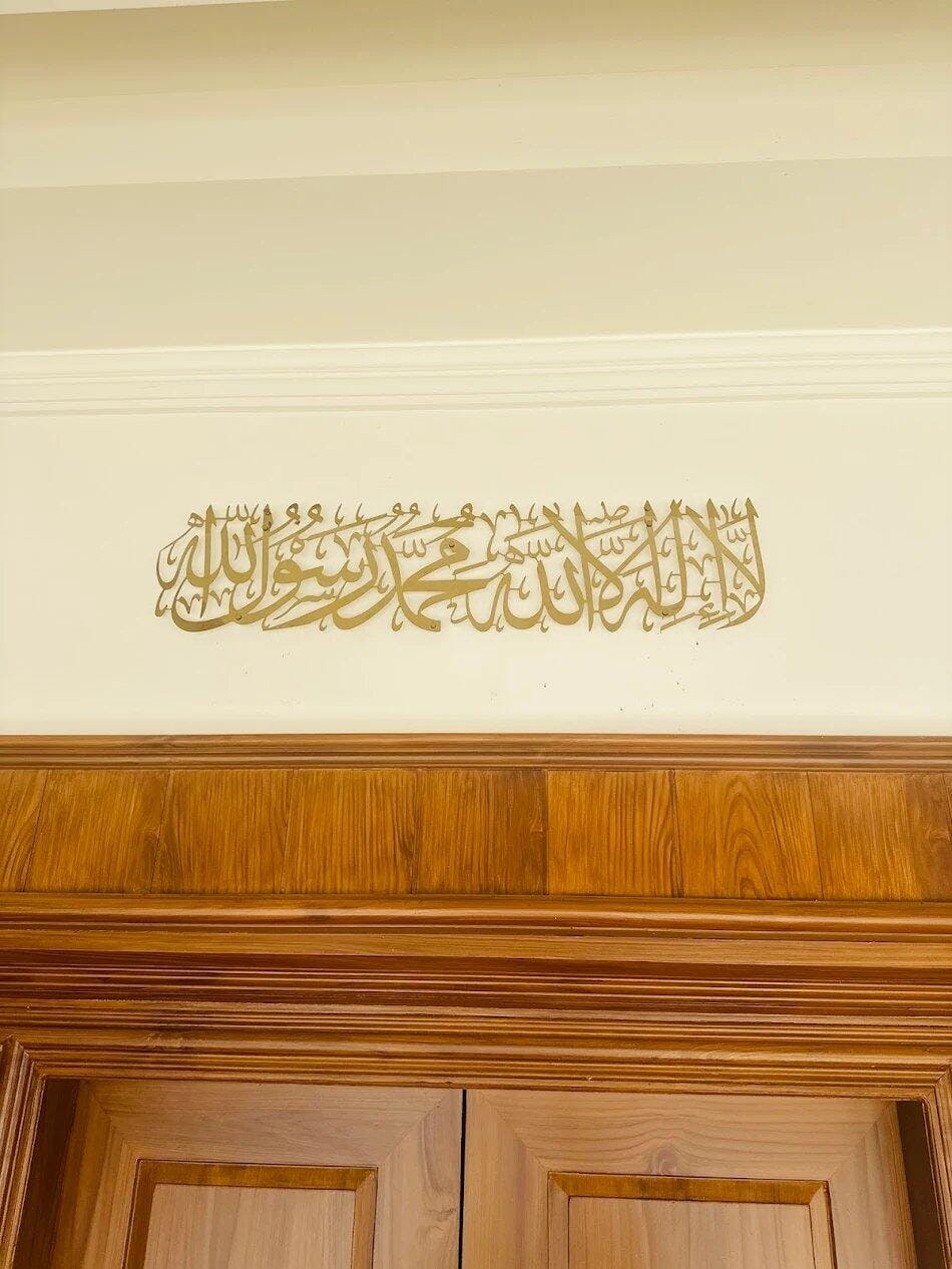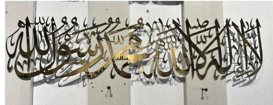 “La Ilaha Illa Allah Muhammad Rasulullah” means “There’s no god but Allah, and Muhammad is His Messenger.” Beautifully done in calligraphy. a remembrance of core beliefs every time you see it ".