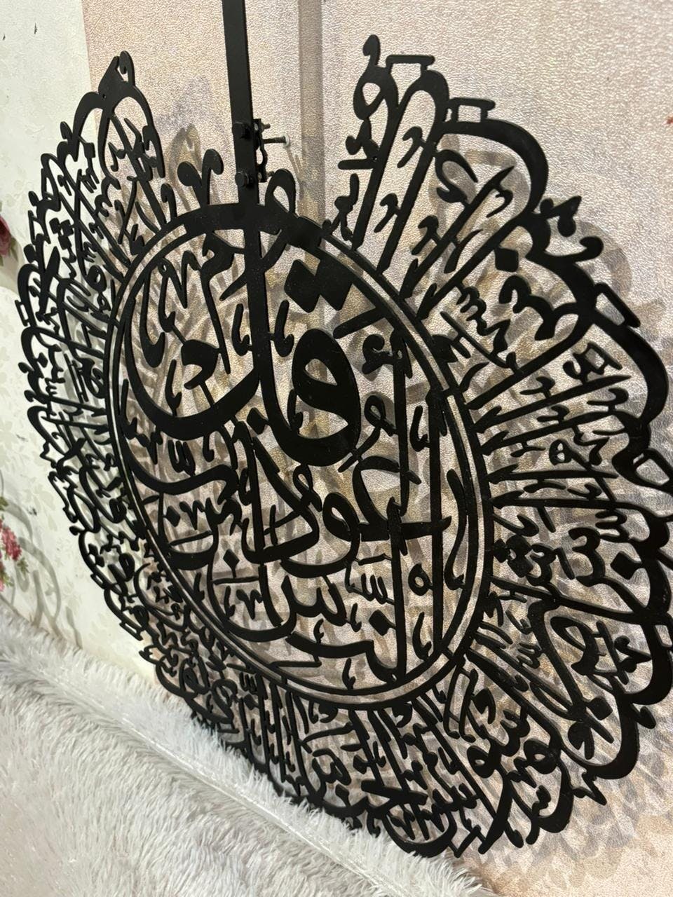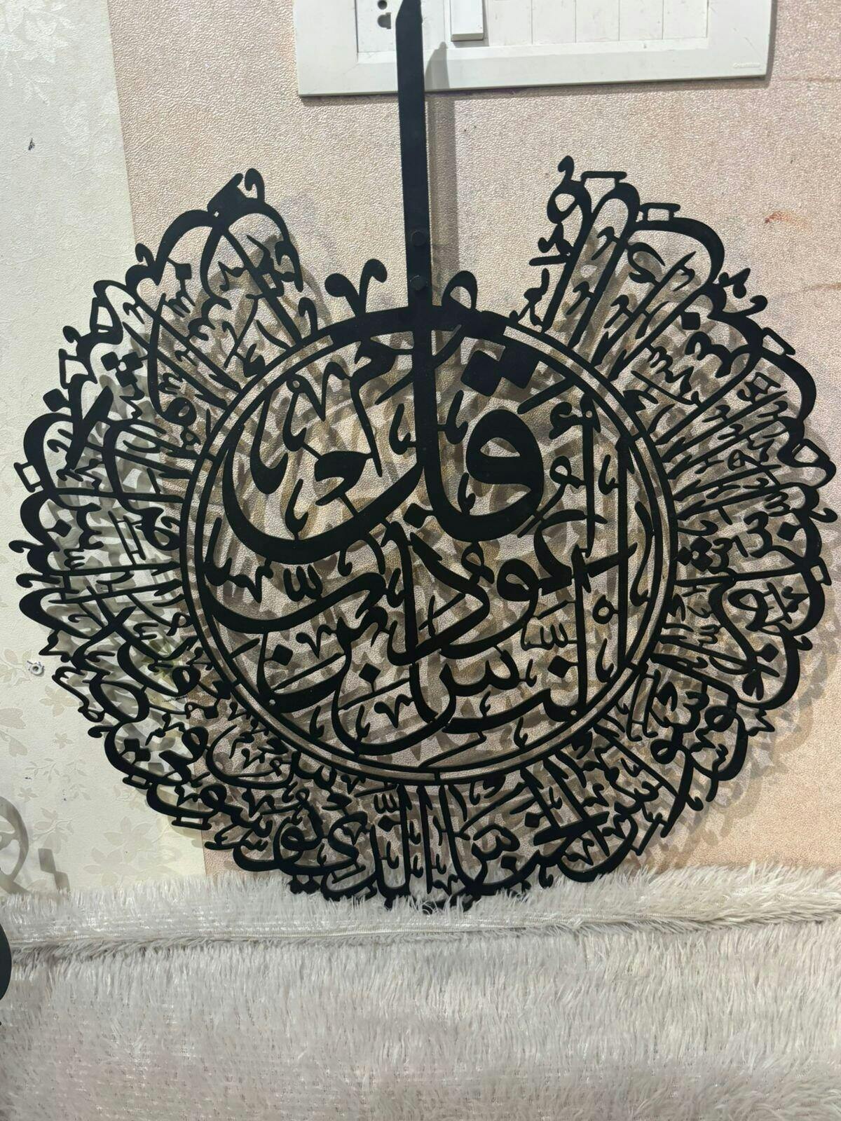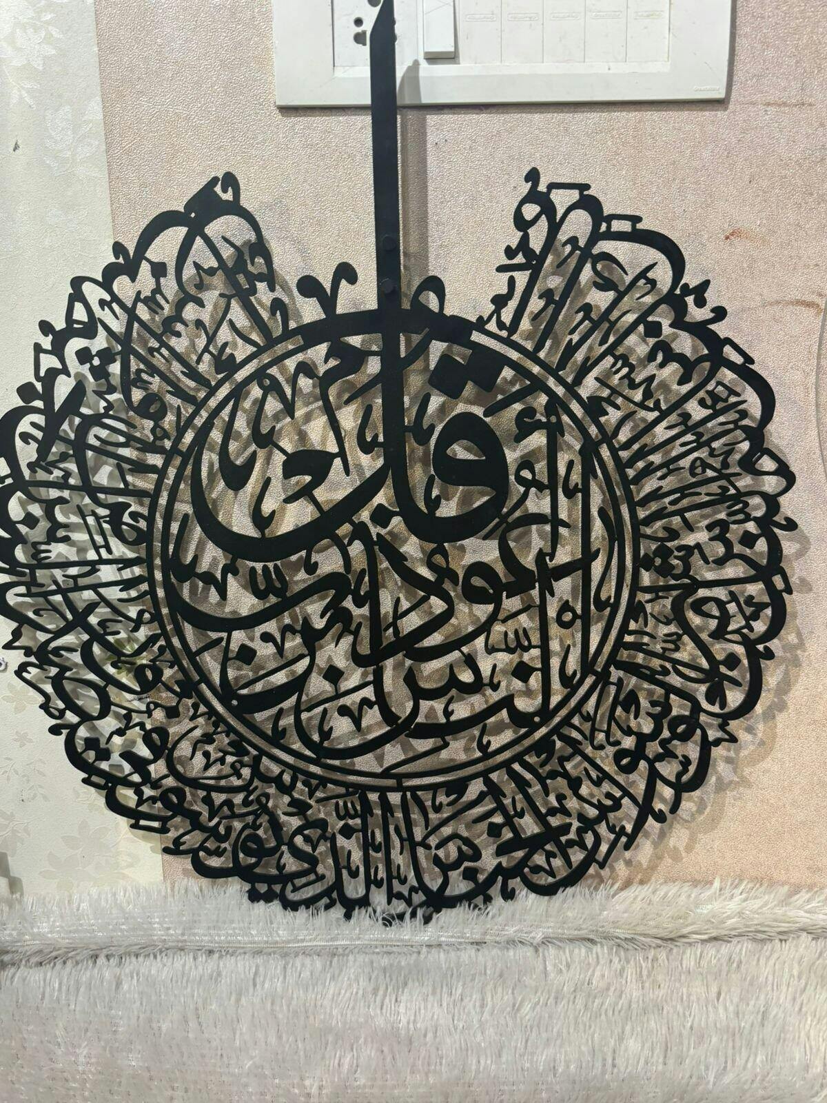 “The Circular Kufic‑inspired style Displayed prominently in living spaces or Prayer hall, known as the “Chapter of Mankind.” The surah is a direct supplication to Allah, asking for protection from the evil of the whisperer (i.e., Satan or hidden insinuations) coming from within yourself or others”.